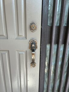 玄関にはサムラッチ錠が取り付けられており、一般的なギザギザのシリンダー(ギザキー)が使用されていました。