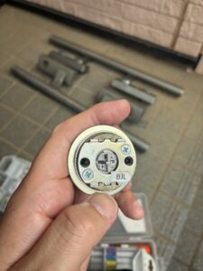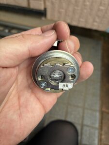 今回取り付けるのは PRシリンダー。ピッキングに強く、複製も難しいディンプルキー仕様で、安心して使える最新の防犯シリンダーです。また、旧型ケースがついていた為、下の写真の様に横カムから縦カムへ変更し、旧型ケースのまま使用できる様にしました。