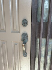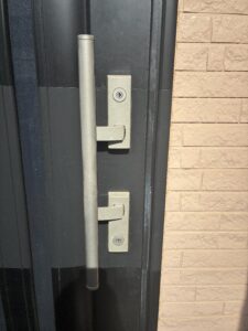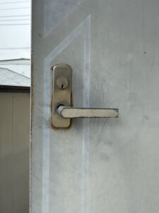 今回は印西市のお客様より「玄関の鍵が古くなってきたので交換したい」とのご依頼をいただき、ウエスト製の面付錠からミワ製の面付錠へ交換を行いました。施工前の様子こちらが交換前の状態です。ハンドルタイプのウ